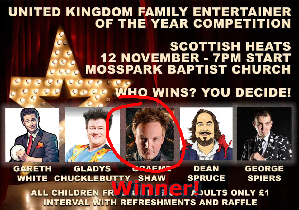 Pleased and shocked to have won the Scottish heat of “Family Entertainer Of The Year” competition.